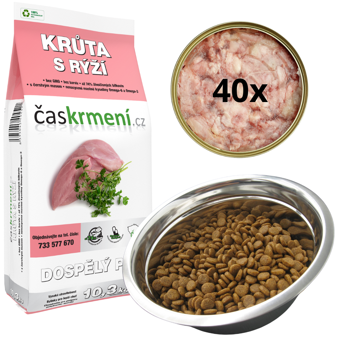 Granule Časkrmení a 40 x konzervy Časkrmení - výhodné balení krmiva, které se k sobě skvěle hodí. Celkem tedy kupujete 10,3kg + 32kg = 42,3 kg krmiva.