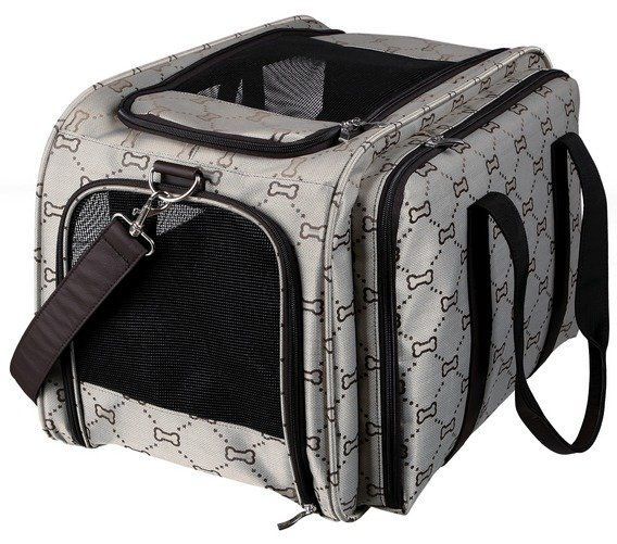 Luxusní přepravní taška MAXIMA od výrobce Trixie se může pochlubit lehkým, moderním designem a střízlivými barvami, které nevyjdou z módy. Převládající barvou tašky je stříbrno-šedá. Ta je také podkladem pro vzor ve tvaru psích kostiček černé barvy, které jsou propojené tečkovanými čárami též tmavé barvy.