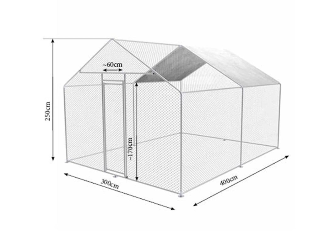 Výběh pro drůbež, rozměry 300x400x245 cm, velikost ok 45x25mm, snadná montáž, pozinkované trubky Ø25x0,65mm. Jestliže hledáte menší výběh pro slepice nebo jinou drůbež, máme pro Vás skvělé řešení. Výběh můžete na zahradě sami jednoduše sestavit. Výběh je vybaven ochrannou plachtou, která drůbež bude chránit před sluncem. Vyrobený je z pozinkovaného kovu a vydrží vám po dlouhá léta. Do výběhu budete mít snadný přístup skrz dostatečně velkou branku.