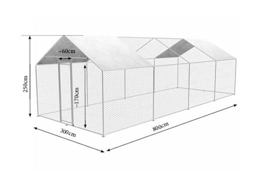 Výběh pro drůbež, rozměry 300x800x245 cm, velikost ok 45x25mm, snadná montáž, pozinkované trubky Ø25x0,65mm. Jestliže hledáte velký výběh pro slepice nebo jinou drůbež, máme pro Vás skvělé řešení. Výběh můžete na zahradě sami jednoduše sestavit. Výběh je vybaven ochrannou plachtou, která drůbež bude chránit před sluncem. Vyrobený je z pozinkovaného kovu a vydrží vám po dlouhá léta. Do výběhu budete mít snadný přístup skrz dostatečně velkou branku.