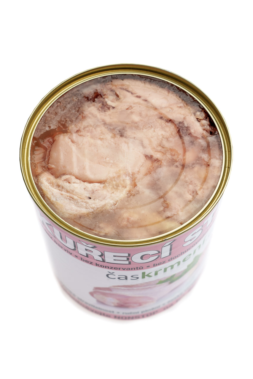 Masové konzervy Kuřecí stehna Časkrmení 800g s vysokým podílem svaloviny, bez konzervantů, barviv a dochucovadel. Ručně plněné konzervy od českého výrobce.