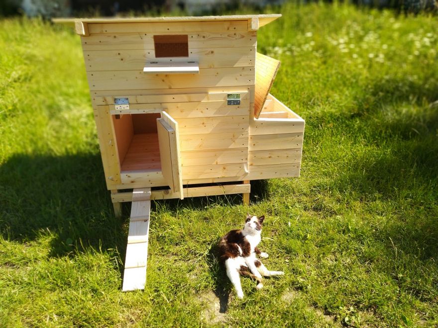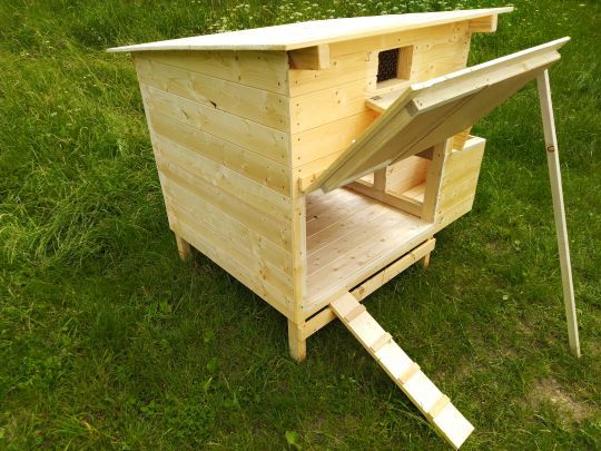 A konečne väčšina bezplatných aj príplatkových variantov v jednom konečnom prevedení. Na týchto fotkách síce nie je na streche použitá bovrovka, ale je tu vyvýšenie, vrátane zdvojenia nôh, ich spevnenia, rampičky s voliteľným nasmerovaním rebríka, ďalej automatické dvierka vrátane ponechaných pôvodných, náter hnedou lazúrou a ďalšie drobnosti, ktoré vám uľahčia chov.